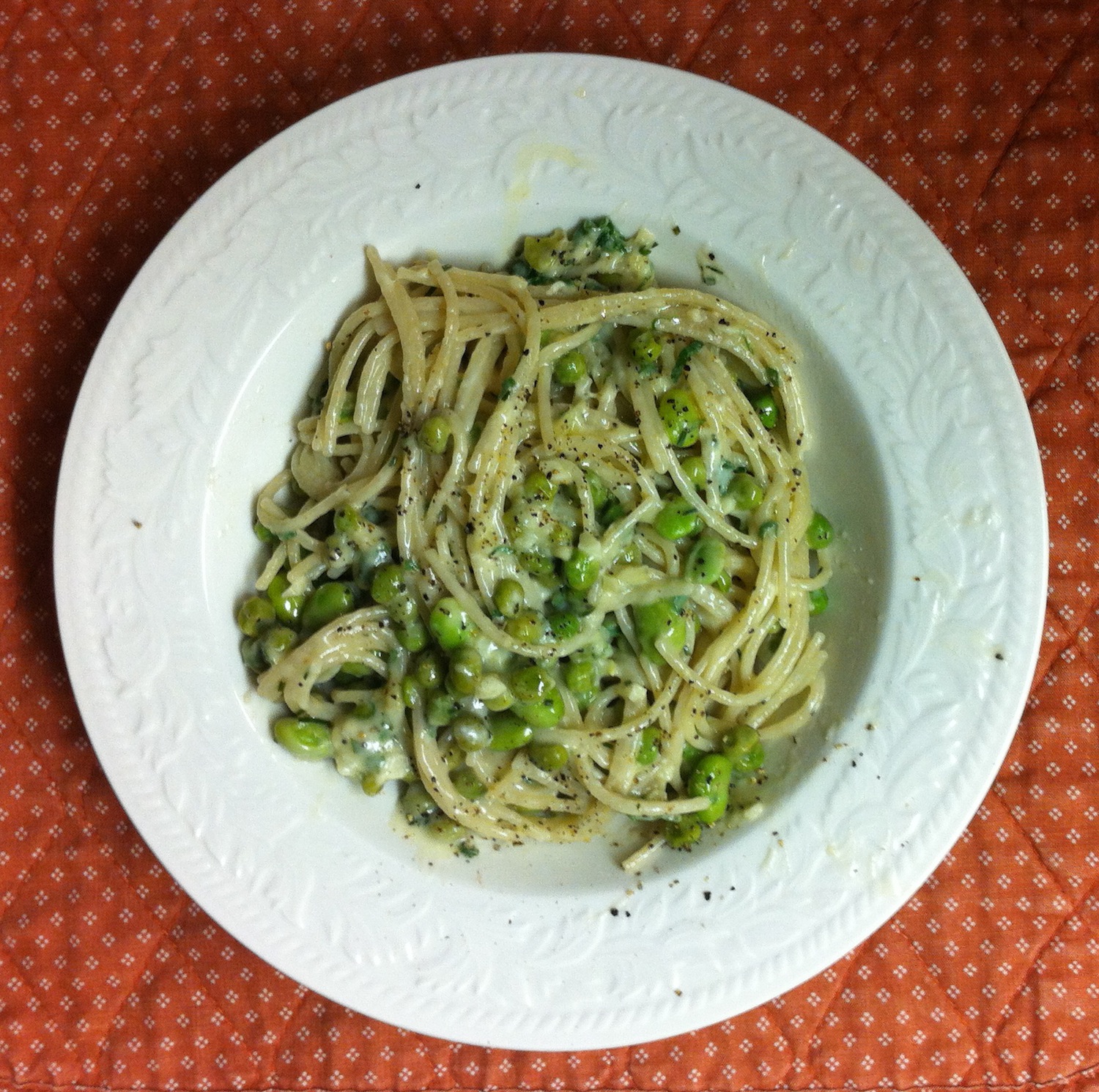 In the meantime, heat butter and oil in a pan. Add garlic and sauté for 2 minutes. Add edemame, peas and white wine. Cover pan and let simmer for 5 minutes or until edemame is tender.
