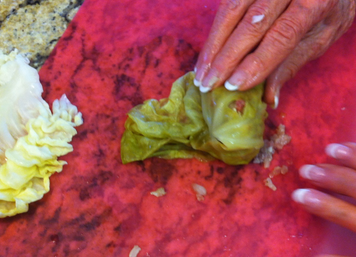 When the cabbage heads are cooked, take them out of the pots and set on counter to cool slightly. Then gently separate the leaves, placing them singly in a line on the counter. Starting with one leaf, slice out the hard part of the core and discard. Using approximately one heaping tablespoon of meat mixture, put it in the leave and roll it up, burrito style. * Place the rolls in the Dutch oven, Repeat process, fitting the rolls tightly together in the bottom of the pot. The start a second layer. You should have 3 layers of rolls by the time you are finished.