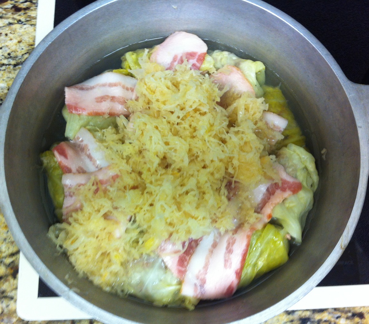 Or, to freeze for later use, separate into smaller portions transferring rolls one by one into ovenproof containers; pour a bit of the cooking liquid into each container and top with portions of sauerkraut and bacon. To reheat: thaw and cook slowly in a 275-degree oven for 1 ½ to 2 hours.