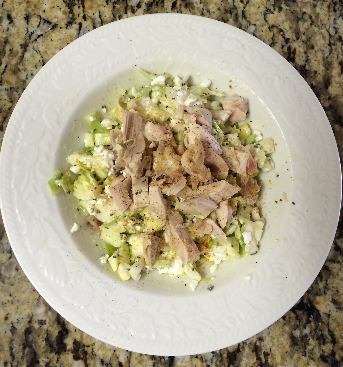 Top with 1/3 cup of organic roasted chicken and a dash of cayenne pepper (substitute chicken for tuna, roast beef or pork, edamame or seasoned tofu, etc.)