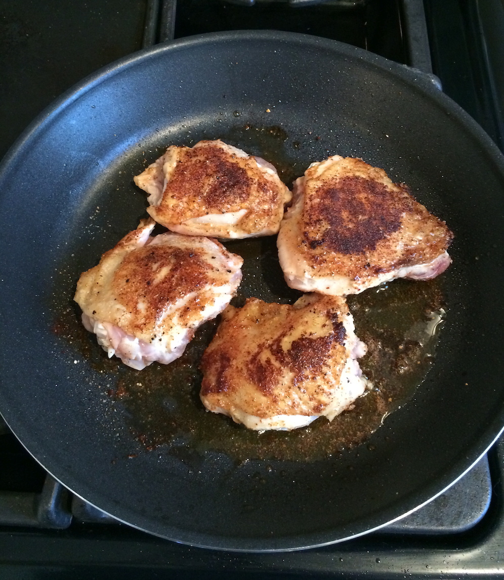 Bring oil and butter to medium heat in a frying pan, add the chicken thighs, skin-side down, and season the exposed sides of the thighs, as above. Cook until skin is nicely browned and a bit crispy.