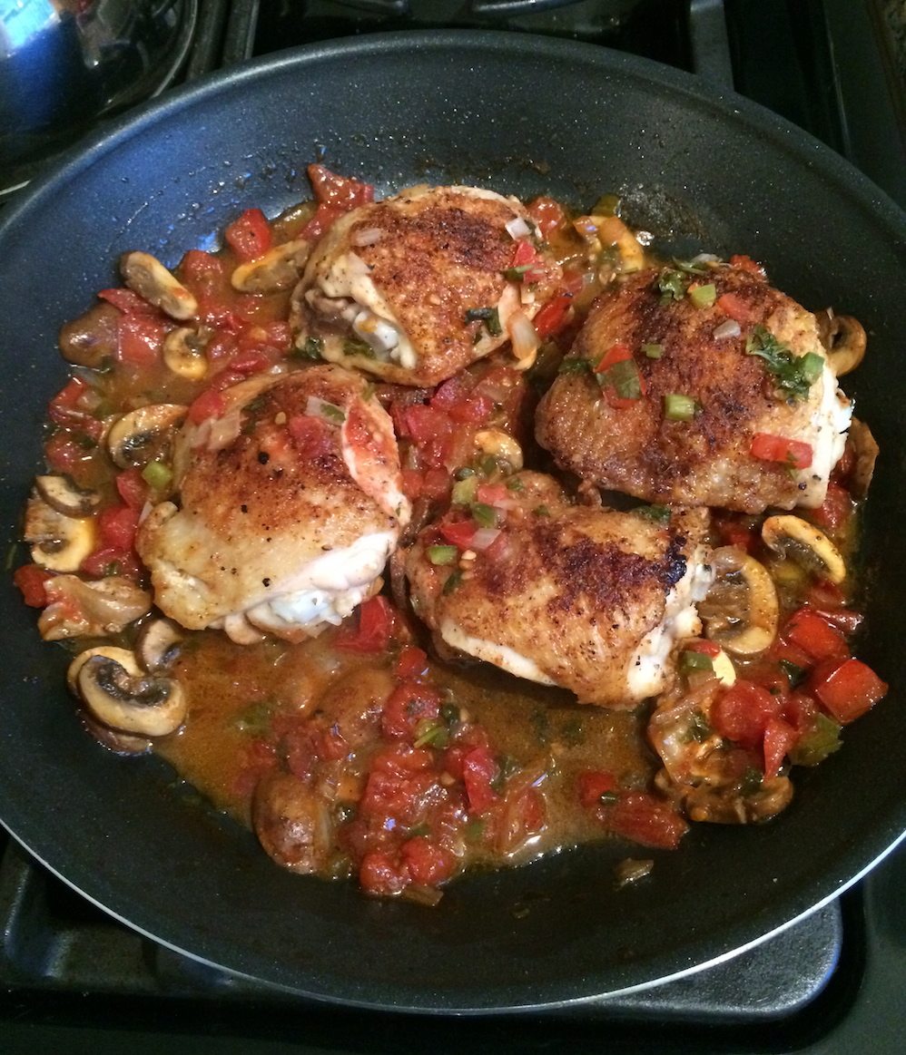 Turn the chicken over and add mushrooms. Cook until mushrooms soften slightly. Reduce heat to medium low and add Pico de Gallo and wine. Cook for about 5 minutes, then cover pan, reduce heat to low and braise for 20 minutes.