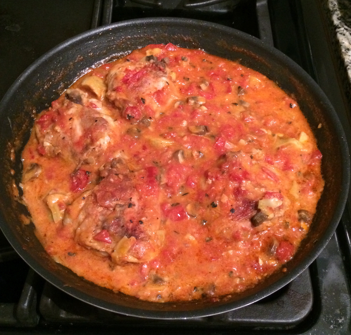 In my version, the tomatoes and their beautiful juices mix with the pan juice from the chicken to create the broth. The tomatoes cook down into a thick sauce while the meat simmers to fork-tenderness in the process. I added mushrooms and artichokes for chunkiness … and also because I love their flavor … and used a bit of Alfredo sauce (or you could use a touch of cream) only because I was in the mood for a pink sauce. But this recipe would be just as tasty without it.