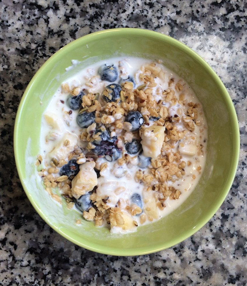 This recipe is for one person. It has lots of antioxidant value (blueberries), potassium (banana), lactobacillus (yogurt) and fiber (grains) – a great start to your morning.