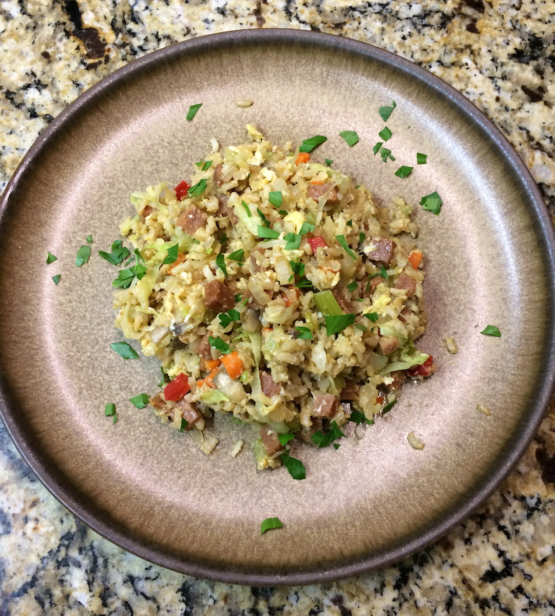 The first time I made fried rice I used a yummy-looking recipe I found in a magazine. But, OMG, there was more sautéing, then setting aside, then this, then that, a very complicated, time-consuming affair for a pretty simple dish. I was doing all the this’s and that’s, and thinking why is this not a one pan preparation?